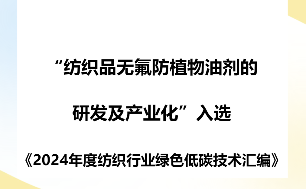 “紡織品無氟防動物油劑的研發及財產化”當選《2024年度紡織行業綠色低碳手藝匯編》 12月5日,中國紡織財產結合會科技成長部與中國紡織財產結合會社會義務辦公室結合體例的《2024 年度紡織行業綠色低碳...[+進行檢查概略]
